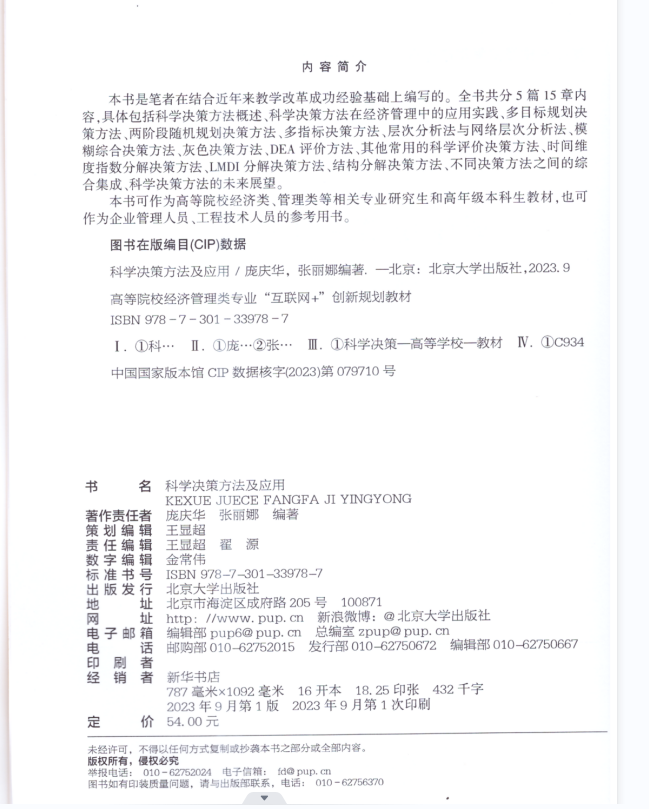 5g影院 庞庆华教授与张丽娜副教授在北京大学出版社出版了《科学决策方法及应用》。本书共分为5篇15章,包括基础篇、科学配置篇、科学评价篇、因素分解篇和思考篇。本书主要面向于研究生教学,受到5g影院 研究生精品教材项目资助。