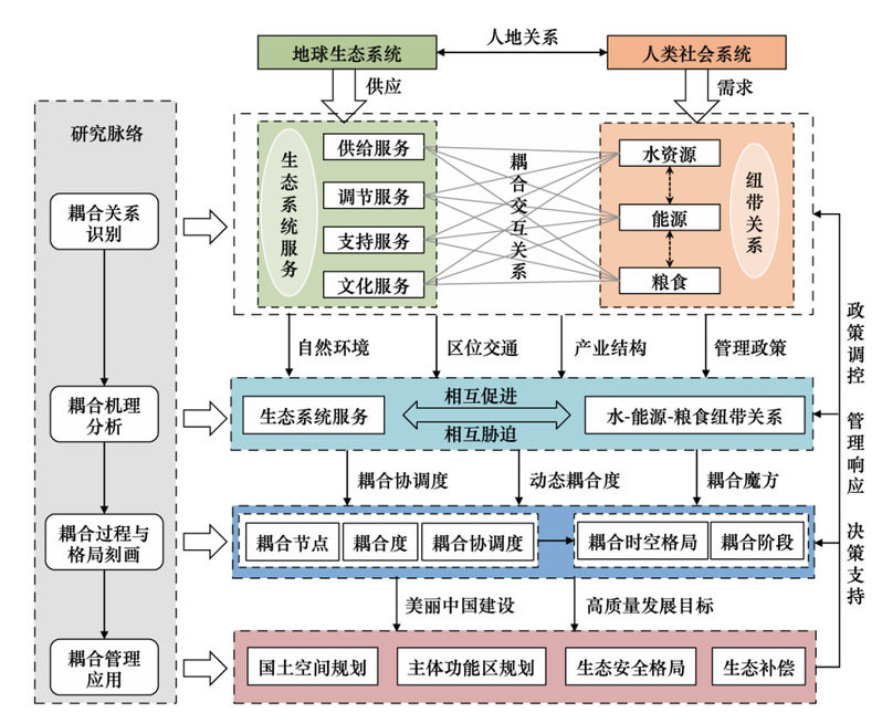 由于WEF-Nexus与生态系统服务耦合研究在理论体系上存在欠缺,因此需构建WEF-Nexus与生态系统服务耦合的理论研究框架,这不仅为深化耦合关系研究提供科学基础,也为实现美丽中国建设以及高质量发展目标等提供理论支撑。因此,本文依据人地关系理论,结合纽带关系系统-地球生态系统耦合分析框架,以“耦合关系识别-耦合机理分析-耦合过程与格局刻画-耦合管理应用”为研究脉络,探索构建了WEF-Nexus与生态系统服务耦合研究框架(图2)。