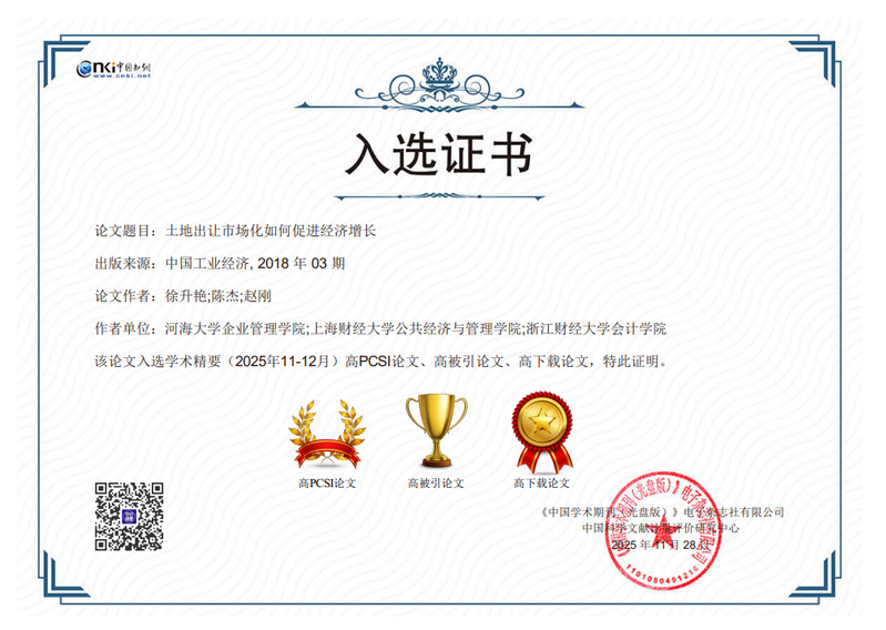 徐升艳教授长期深耕土地经济领域,她在经济学权威期刊《中国工业经济》2018年第3期发表的合作论文《土地出让市场化如何促进经济增长》,最近入选中国科学文献计量评价研究中心高PCSI论文、高被引论文、高下载论文。目前该论文在中国知网被引用237次,下载7512次。
