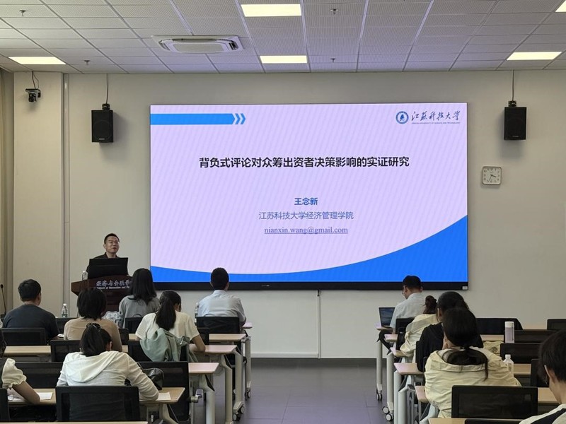 院长庞庆华主持活动。报告基于全球众筹市场爆发式增长背景,聚焦众筹项目发起人背负式评论行为对出资者决策的影响机制。研究突破传统分析框架,创新性地将发起人行为纳入研究体系,构建包含发起人角色、出资决策过程和背负式评论行为的理论模型,提出三类研究假设。通过面板Tobit模型实证分析发现:背负式评论对被评论项目众筹筹资绩效存在负向影响,发起人背负式评论行为可以减弱其负向影响,揭示评论抑制效应和注意分散效应的双重影响机制。研究采用内生性检验排除社交平台影响,通过更换因变量和估计模型进行鲁棒性检验,证实结论可靠性。该研究理论层面拓展了众筹研究边界,为平台评论区管理提供新视角,但在数据限制、遗漏变量和异质性等方面仍存在改进空间。互动环节中,参会师生就“背负式评论的互动性”与王教授展开深入探讨。庞庆华院长对本次讲座进行总结,并为王念新教授颁发讲座专家证书,感谢其对5g影院