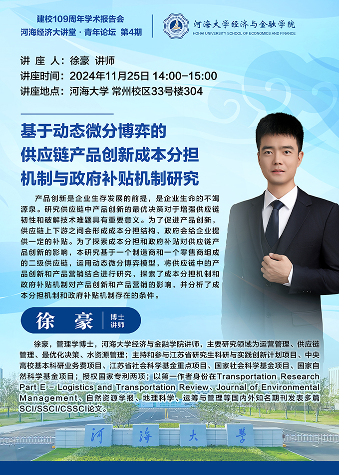河海经济大讲堂·青年论坛 第4期:基于动态微分博弈的供应链产品创新成本分担机制与政府补贴机制研究