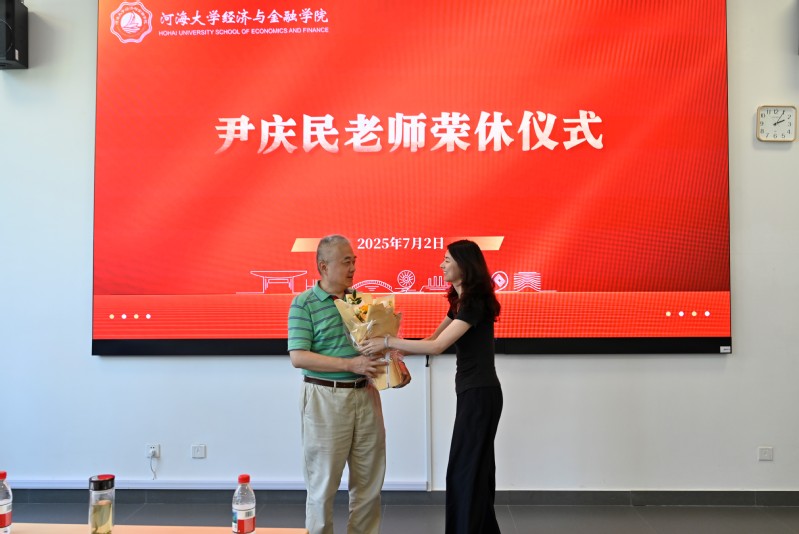 在常州校区33号楼102会议室举行尹庆民老师荣休仪式。学院全体班子成员、教职工参加了荣休仪式,学院党委书记李娜主持荣休仪式。荣休仪式上,庞庆华院长向尹庆民老师赠送荣休纪念品,金融系教师代表金宇彤老师向尹庆民老师献上鲜花。尹庆民老师深情回顾了在学校、学院的工作历程,对学院和同事给予自己的帮助表示感谢,并真切的表达了对学院未来的美好祝愿及对所有同事的不舍之情。他们表示,在退休之后将继续关心支持学院发展建设,离岗不离心,竭尽所能发挥余热、贡献自己的力量。学院党委书记李娜介绍了尹庆民老师在学院的工作经历和主要工作成果,并代表学院向荣休教师表达了感谢与敬意。李娜书记讲到尹庆民老师是学院事业的参与者、见证者、贡献者,是学院的骄傲和荣光。希望尹老师继续情牵校园,心系学院,始终如一关心关注支持学院各项工作;将奋斗精神和宝贵经验传承给年轻一代,退休不褪色,当好青年教师的“辅导员”、学生成长的“守护者”、学院发展的“智囊团”和文化传承的“播种机”,同时希望青年一代拿起接力